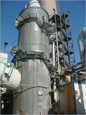1.2.2吸收塔系統(tǒng):煙氣從吸收塔中下側(cè)進(jìn)入與上側(cè)噴淋的石灰石漿液逆流接觸,在塔內(nèi)進(jìn)行化學(xué)反應(yīng),對落入吸收塔漿池的反應(yīng)物再進(jìn)行氧化反應(yīng),得到脫硫副產(chǎn)品二水石膏。經(jīng)吸收劑洗滌脫硫后的清潔煙氣,通過除霧器除去霧滴后由吸收塔上側(cè)引出,排入煙囪。